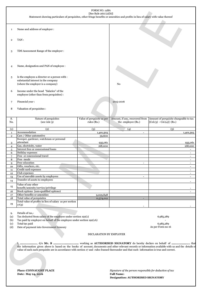 This is an income tax form that is filled by an individual joining a new company in the middle of the year. Form 12BA shows the details of income earned by the individual from the previous employer. The form consists of PAN No. TAN no. of previous employer, breakup of the salary, TDS on salary deducted, deduction with respect to provident fund.