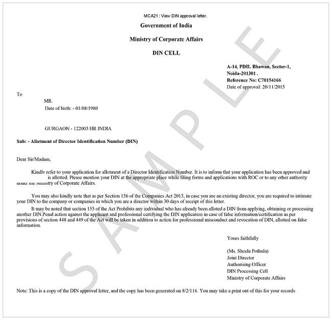 DIN is a unique identification number given to new director of a company which is incorporated. The purpose of Director Identification Number is to keep a database of the directors of incorporated companies and complete information about the directors, so that they can be traceable. It also relates his participation in other companies, past and present.