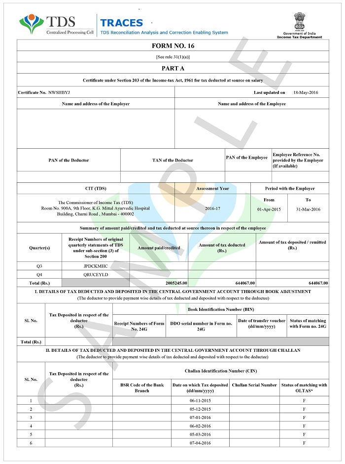 It is a TDS Certificate that the employers issues to its employee as a proof of TDS deduction. Form 16 A is issued when payments are non-salary such as professional fees, rent, bank interest payments. Form 16 A consists of name, PAN and TAN no. of employer, employee details, amount paid, nature and date of payment and receipt no. of TDS payment.