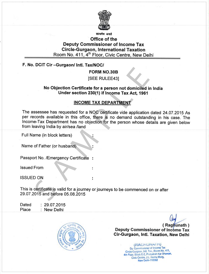 NOC is a No Objection Certificate issued by income tax authorities stating that all dues and taxes liabilities are cleared and income tax office has no objection to the expat travelling out of the country at the end of their assignment.